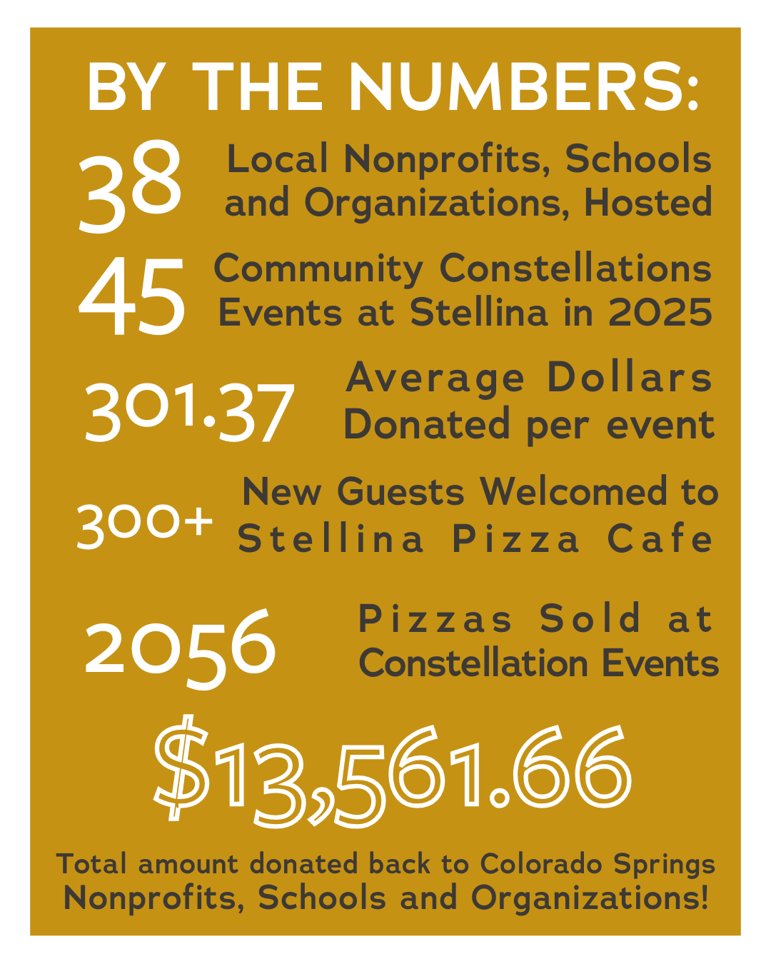 Know of a nonprofit or organization that could use our help? For more information on participating in Community Constellations, email us at info@stellinapizza.co with the subject line: Community Constellations.